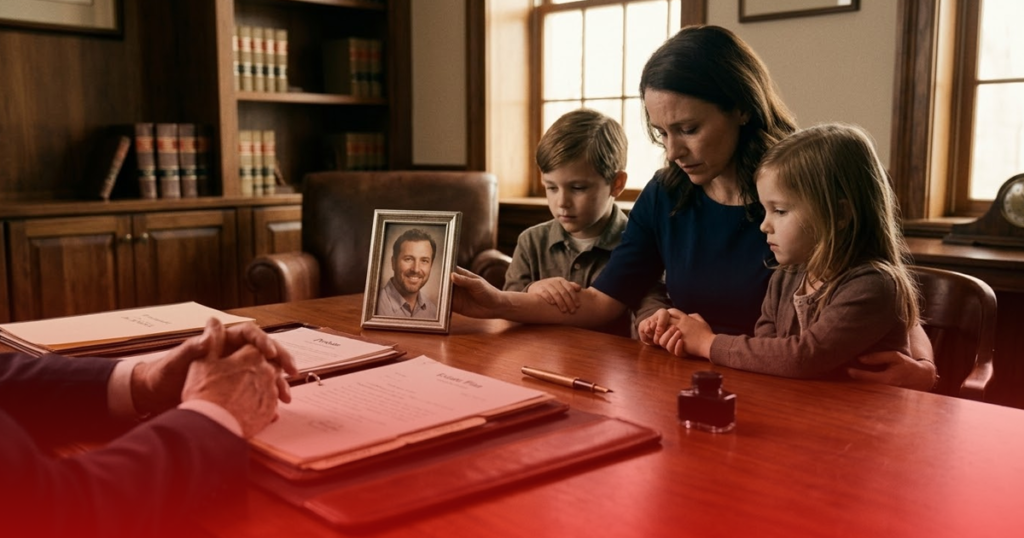 A somber, intimate portrait of a family (mother and two children) sitting in a lawyer's office, looking at a framed photo of a deceased loved one. The lawyer's hands are gently placed on a legal document in the foreground.